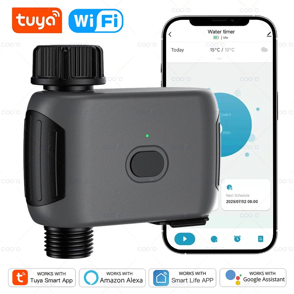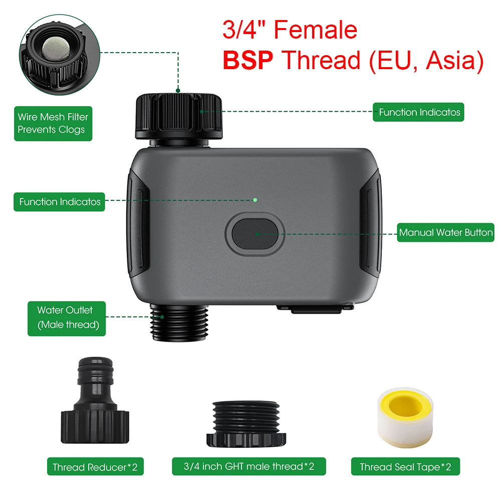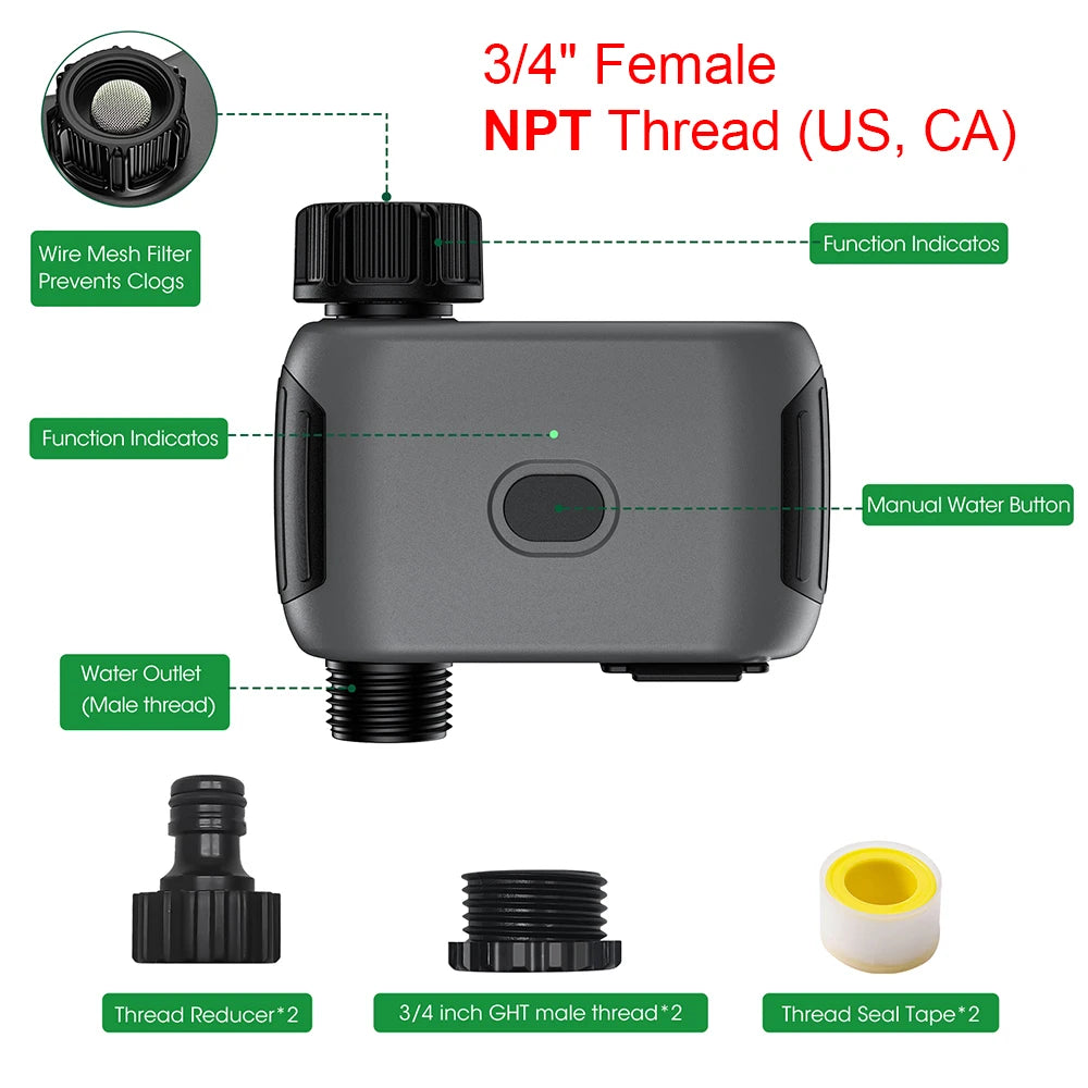 This smart and efficient watering timer features a leak-resistant design made with upgraded nylon material, ensuring smooth and consistent water flow. The durable, high-quality construction prevents leakage, making it a reliable choice for your garden. Its user-friendly design ensures easy installation and precise water control, so your plants are watered with the right amount at the right time. Perfect for anyone looking for a durable and leak-proof irrigation solution.